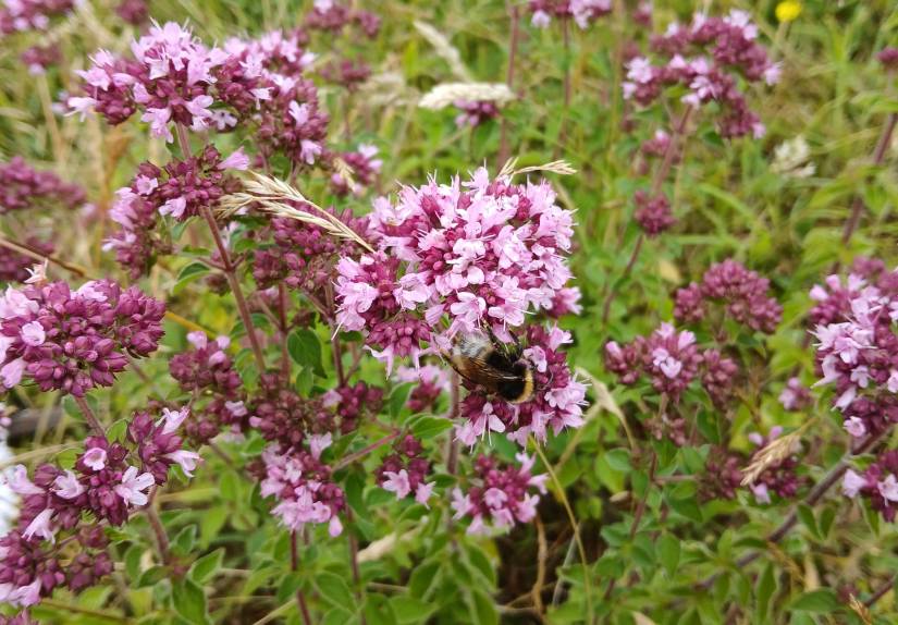 Efforts to transform much of the garden into a wildlife haven continue, and we’re finally in the part of the year when I can start letting the plants take care of themselves. Previous years of infrequent mowing allowed an interesting variety of species to establish in the lawn (doing it this way means I don’t have to research and test to find species that will tolerate dry, alkaline conditions; the plants that like this specific habitat are ready and waiting to grow), and now we reap the benefits. The clumps of wild marjoram that have sprung up are much visited by pollinators.